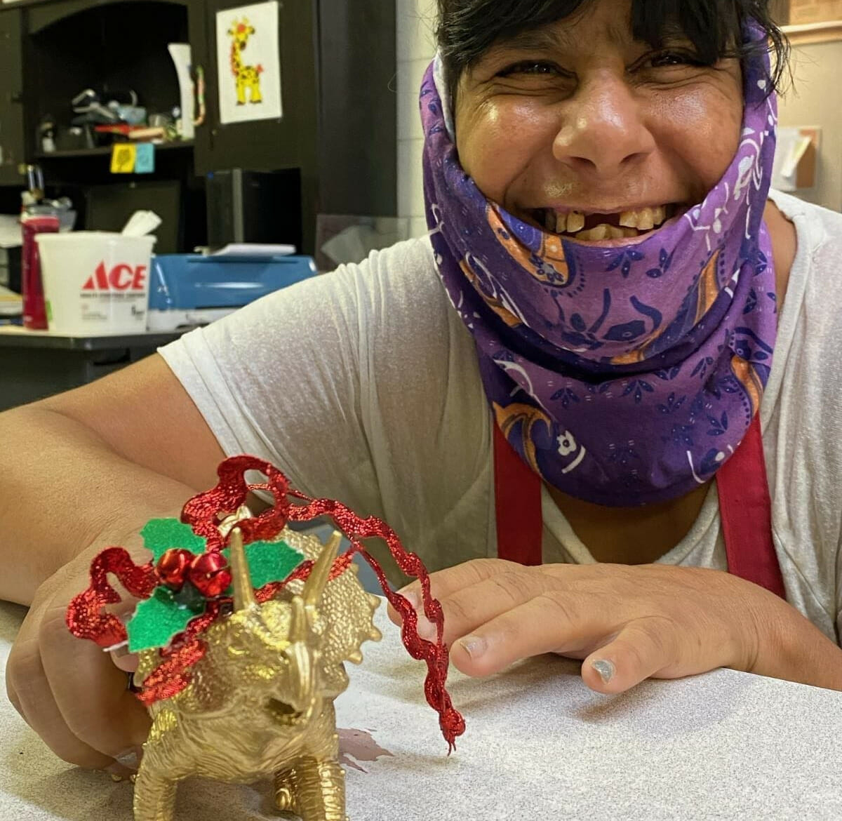 While Casey Gordon supervises individuals in the Coffee Klatch program, her sister Peggy Gordon works with more severely disabled individuals in the Performing Arts vocational program that she supervises. Peggy’s group also participated in making ornaments by using toy dinosaurs that they embellished with paint and tiny wreaths placed around their necks. (reflecting the region’s paleontology importance). They also made ornaments resembling peaches (to represent the Grand Valley’s rich fruit-growing industry), and other ornaments.